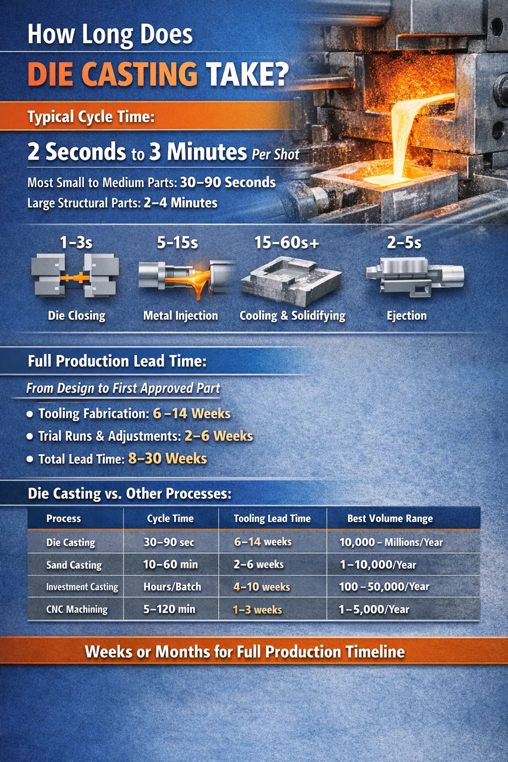 Ce chiffre sur la durée du cycle ne raconte qu’une partie de l’histoire. Avant que la première pièce en bon état ne sorte de la chaîne, une opération de moulage sous pression implique la fabrication de l'outillage (ce qui peut prendre 6 à 14 semaines), la configuration de la machine, le préchauffage de la matrice, les essais et la validation dimensionnelle. De la conception brute à la pièce de production approuvée, le délai complet se mesure en semaines ou en mois, et non en secondes.