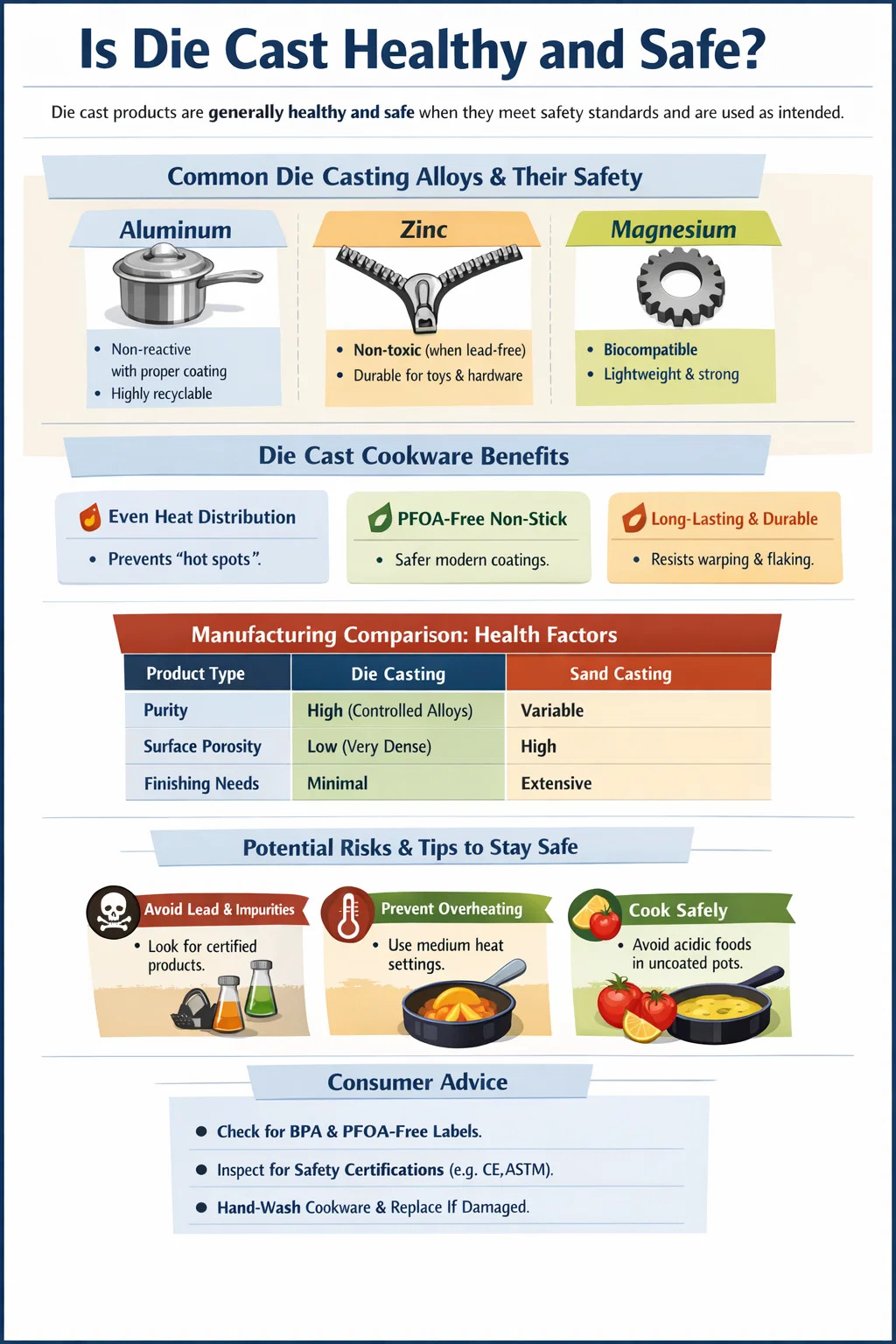D'une manière générale, les produits fabriqués à partir moulage sous pression sont considérés comme sains et sûrs pour un usage quotidien, à condition qu’ils répondent aux normes de sécurité internationales et qu’ils soient utilisés comme prévu. La « santé » d'un article moulé sous pression dépend principalement du métal de base utilisé (comme l'aluminium, le zinc ou le magnésium) et du traitement de surface qui lui est appliqué. Dans le contexte des ustensiles de cuisine, l'aluminium moulé sous pression est très populaire car il est non réactif lorsqu'il est correctement recouvert, tandis que dans les jouets et la quincaillerie, le zinc moulé sous pression est privilégié pour sa durabilité et son absence d'additifs toxiques comme le plomb.