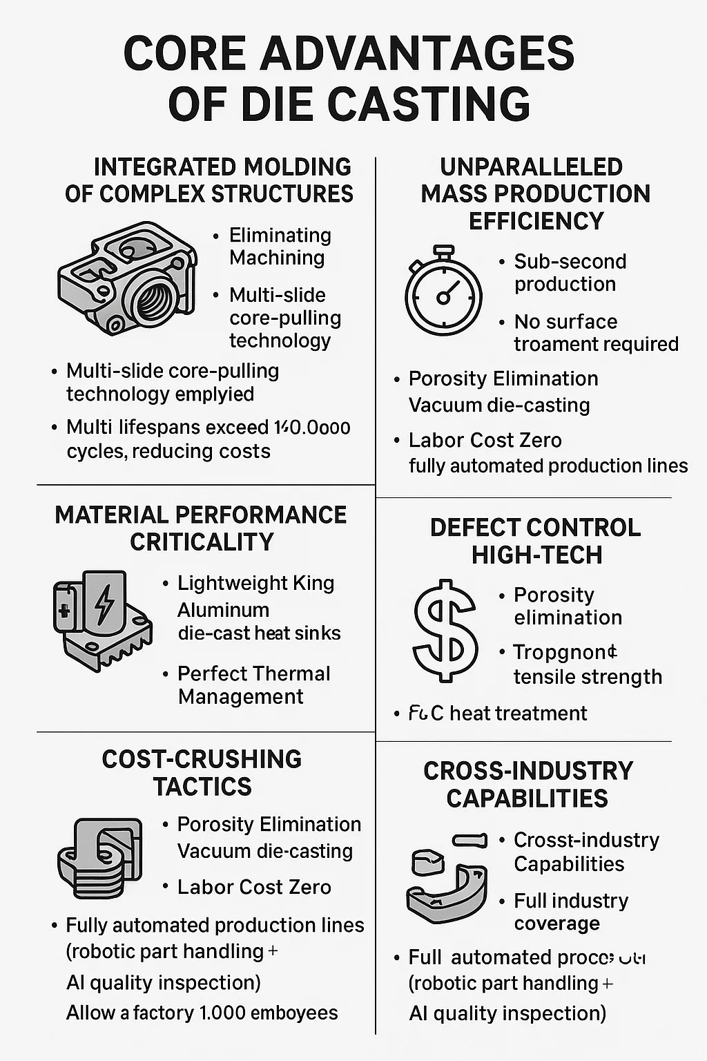Temps de cycle de moulage d'une seule pièce de 10 à 60 secondes (jusqu'à 30 pièces par minute pour les pièces en alliage de zinc), avec une capacité de production 24h/24 et 7j/7 de 10 000 pièces.
