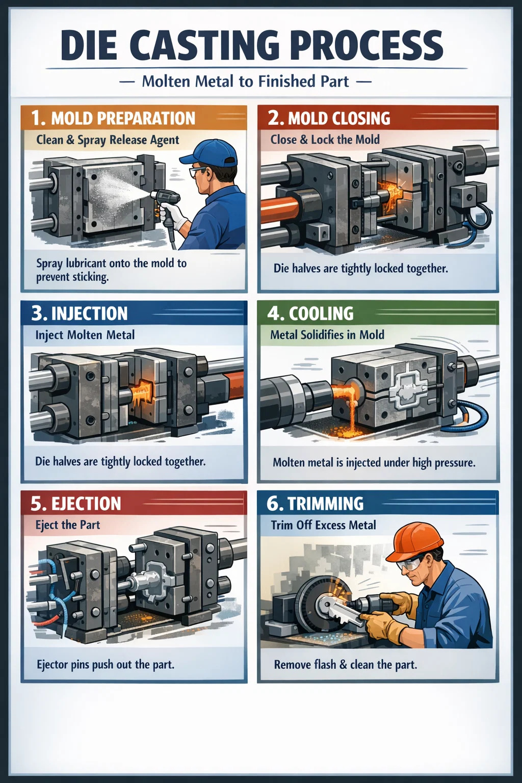 Moulage sous pression c'est comme fabriquer des « glaçons en métal » ou du « moulage par injection haut de gamme ». Il s'agit d'un processus dans lequel le métal en fusion est « forcé » sous haute pression dans un moule de précision, puis refroidi pour former des pièces solides.