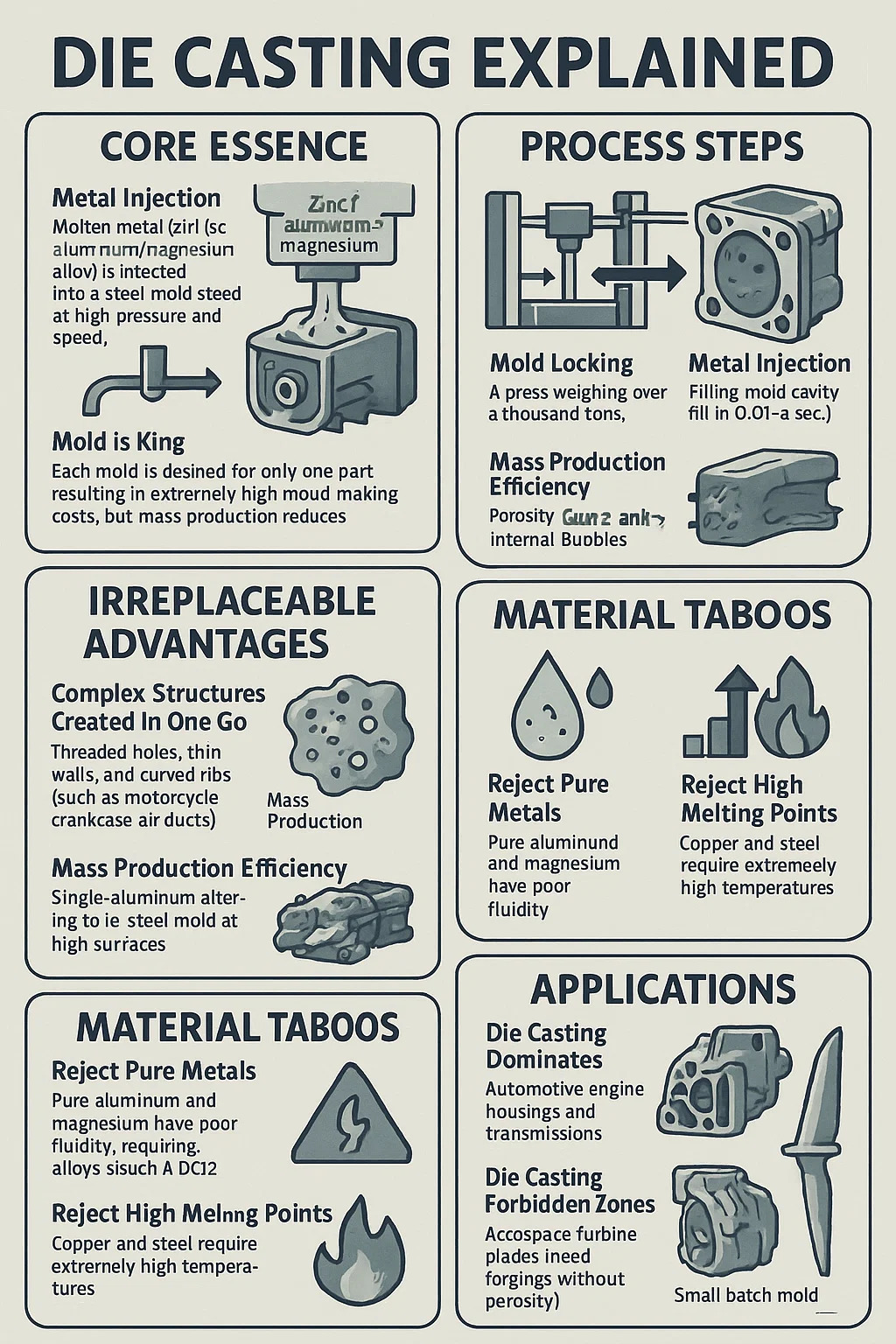 Moulage par injection de métal: le métal fondu (zinc / aluminium / alliage de magnésium) est injecté dans un moule en acier à haute pression et vitesse, et éjecté après refroidissement pour former la pièce.