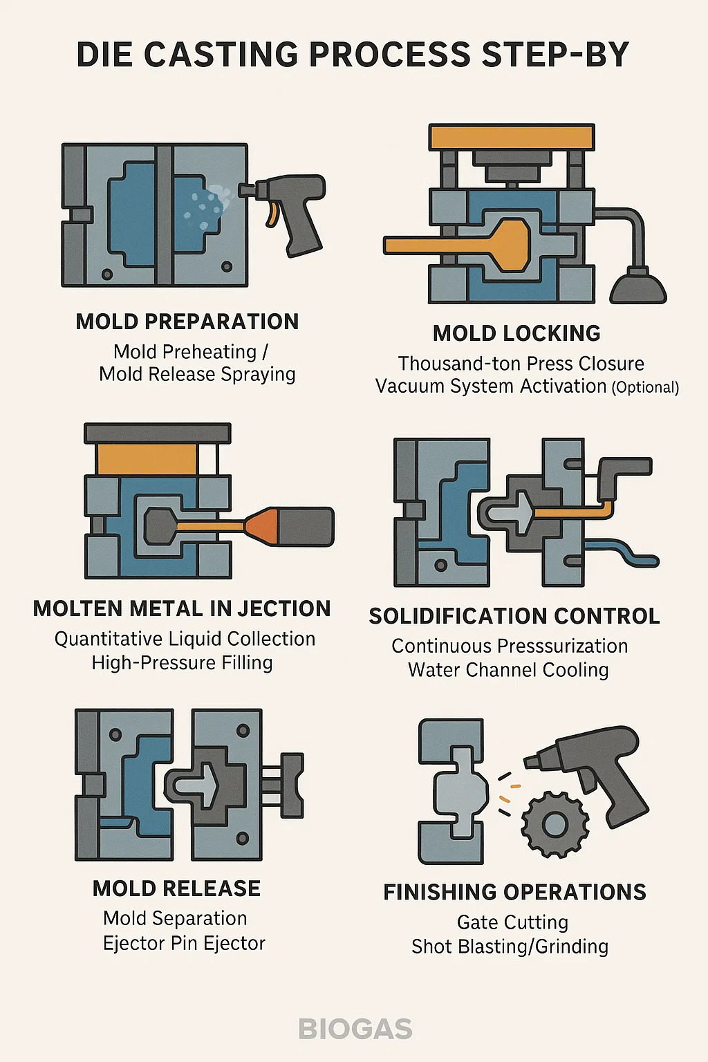 Remplissage à haute pression : un piston injecte de l'aluminium fondu dans la cavité du moule à une vitesse de boulet de canon (30 à 100 m/s), remplissant la cavité en 0,01 à 0,3 seconde.